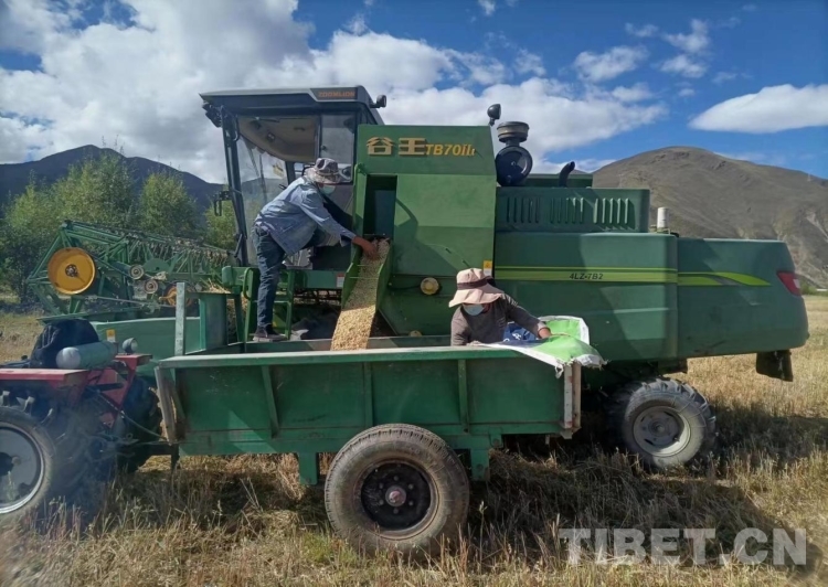 圖為(wei) 國家牧草產(chan) 業(ye) 技術體(ti) 係拉薩綜合試驗站曲尼帕基地燕麥種子秋收搶收工作(海拔3760米)