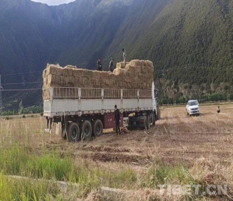 圖為(wei) 國家牧草產(chan) 業(ye) 技術體(ti) 係拉薩綜合試驗站工布江達縣示範點秋收搶收(海拔3990米)打捆裝車的牧草