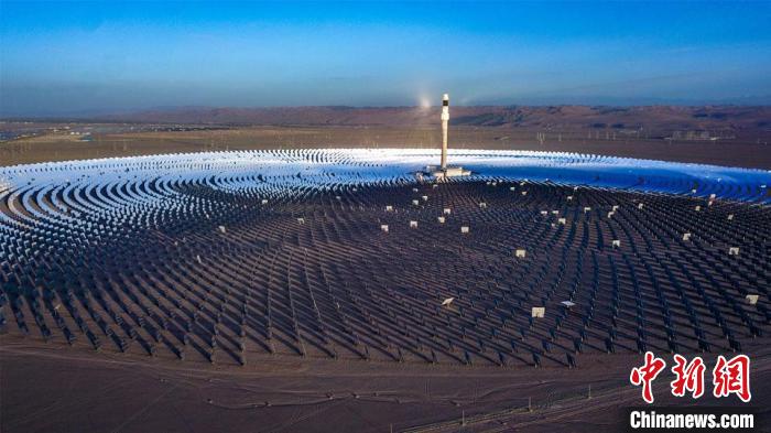 圖為(wei) 10月16日,甘肅省敦煌市光電產(chan) 業(ye) 園區內(nei) ,萬(wan) 餘(yu) 麵定日鏡以同心圓狀圍繞著260米高的吸熱塔。 王斌銀 攝