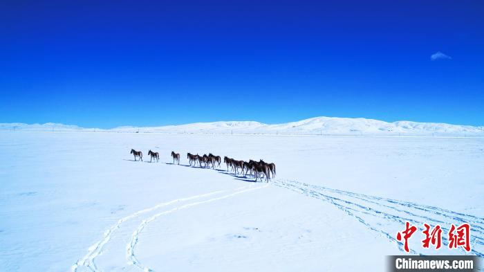 圖為(wei) 黃河源頭瑪多出現積雪,藏野驢群在雪地裏行走。 祁緒龍 攝