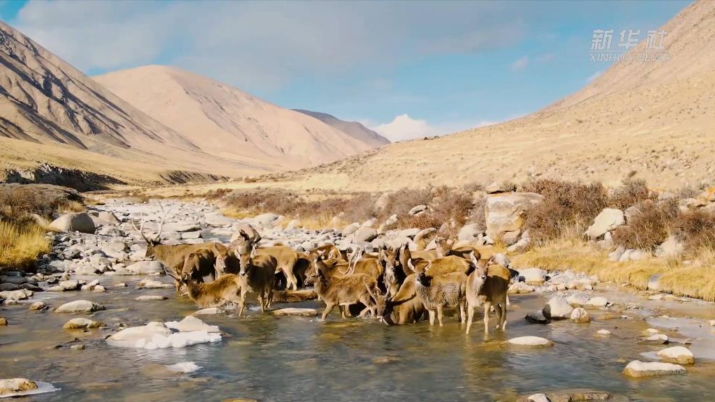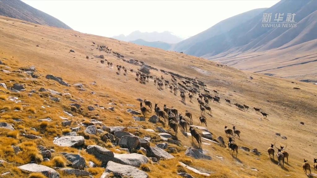 近日,在青海省海西蒙古族藏族自治州德令哈市柏樹山景區,上百隻白唇鹿現身山澗,奔跑嬉戲。