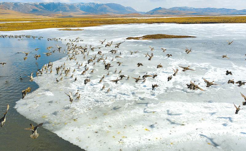 陽光下,數千隻珍稀飛禽在光影交錯的若爾蓋花湖嬉戲翱翔。尹鋼 攝(資料圖片)