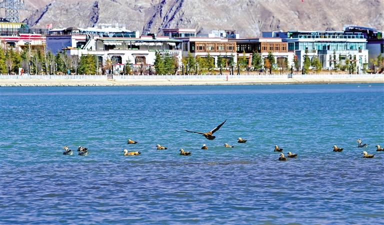 冬日,眾(zhong) 多鳥類匯聚拉薩河畔,勾畫出一道美麗(li) 的“飛翔風景線”。