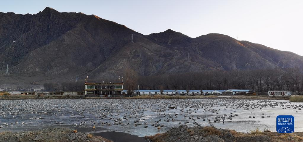 冬日清晨,拉薩市林周縣邊交林鄉(xiang) 的池塘裏,大量斑頭雁、赤麻鴨等候鳥棲息(12月24日攝,手機照片)。新華社記者 沈虹冰 攝