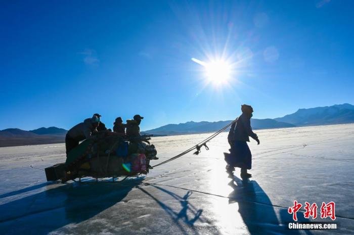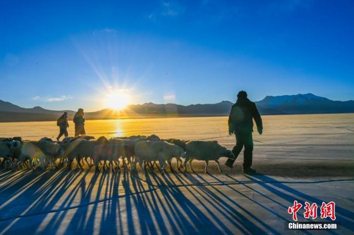 這個(ge) 邊境小村3日迎來了一年一度的“趕羊”盛事。村民們(men) 將1400餘(yu) 隻羊由岸邊通過厚實的冰麵趕往湖心島牧場。普姆雍措被稱為(wei) “仙女之淚”,位於(yu) 西藏山南市浪卡子縣,每到冬季極寒時,便是羊群轉牧場的好時機。