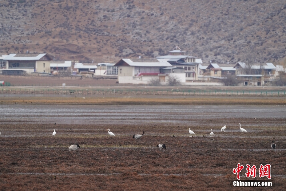 2月21日,覓食的候鳥與(yu) 納帕海遠處的村莊相映成趣。中新社記者 劉冉陽 攝