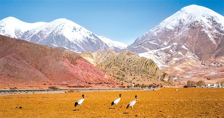圖為(wei) 在拉薩市林周縣,黑頸鶴在雪山腳下的農(nong) 田裏覓食(3月1日攝)。新華社記者 沈虹冰 攝