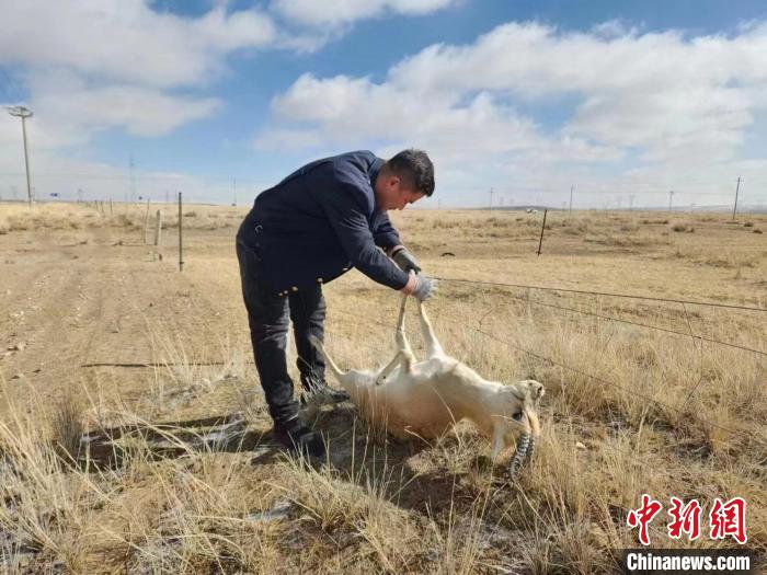據介紹,3月12日11時許,青藏集團公司西寧電務段哈爾蓋信號車間哈爾蓋信號工區的3名職工在徒步前往管內(nei) 那仁中繼站檢修信號設備途中發現,有動物掛在網圍欄,無法掙脫。