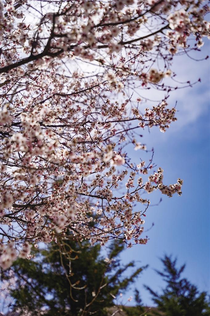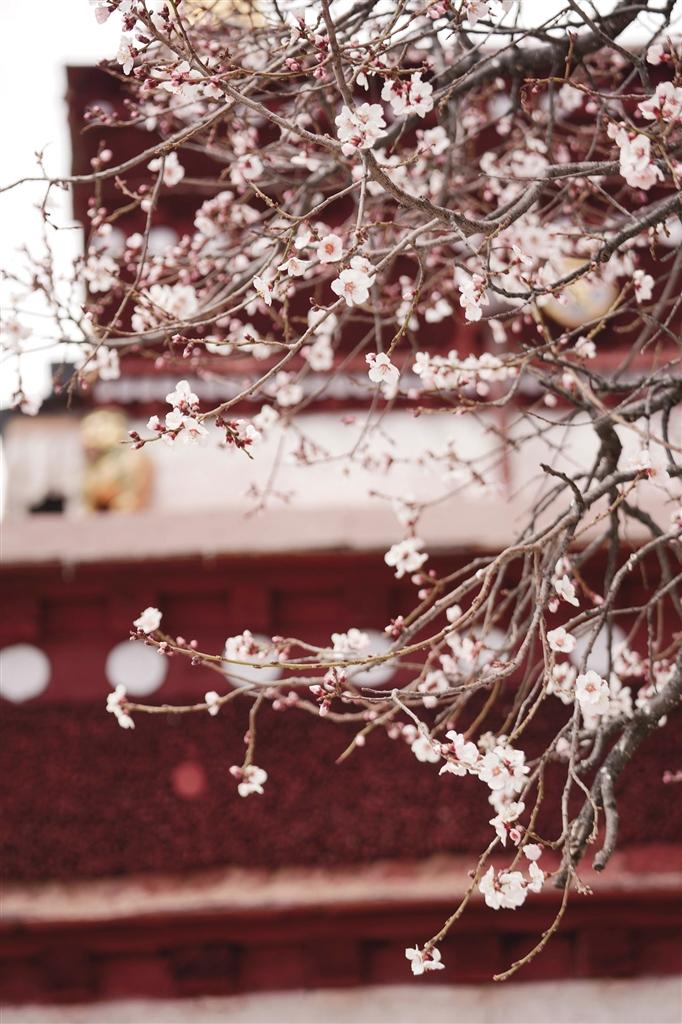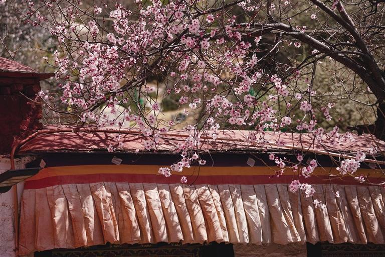 4月的帕邦喀,桃花開得正茂,桃樹枝上早已經掛滿了大大小小的花朵,沿著石板台階走走停停,可以看到桃樹舒展枝條,朵朵桃花爬上枝頭沐浴著春日的暖陽,在藍天白雲(yun) 、紅牆金頂的映襯之下格外美麗(li) ,構成一幅絕妙的春景詩畫。偶爾枝頭傳(chuan) 來清脆的鳥鳴聲,讓這裏顯得愈發靜謐美好。