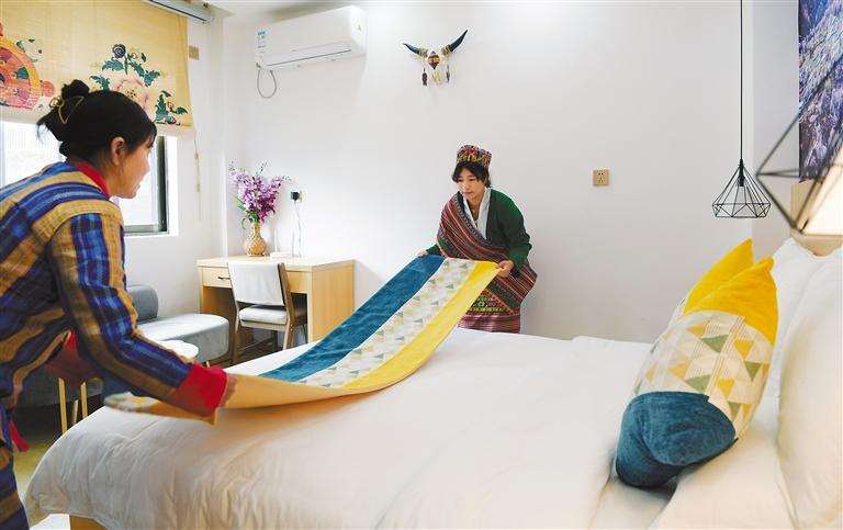 圖為(wei) 林芝市墨脫縣背崩鄉(xiang) 巴登村村民在民宿中整理床鋪。記者 洛桑 攝