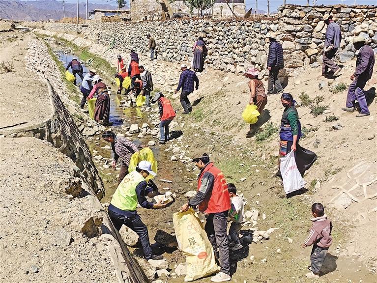 圖為(wei) 幹部職工和環保誌願者在撿拾垃圾。記者 旦增蘭(lan) 澤 通訊員 多吉旦增 攝
