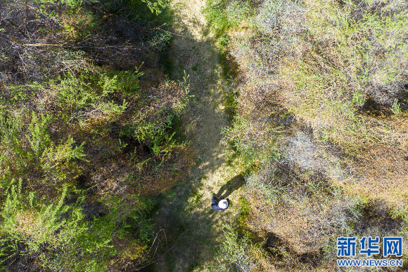 6月8日,索朗拉傑在沙棘林裏(無人機照片)。新華網 旦增努布 攝