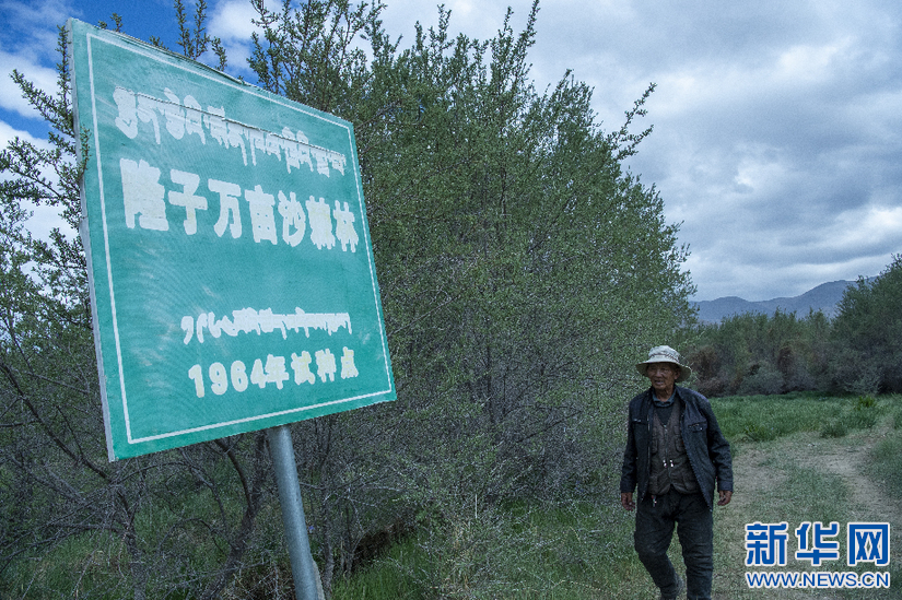 6月8日,索朗拉傑在介紹當年試種沙棘、楊樹、榆樹等的情況。新華網 旦增努布 攝