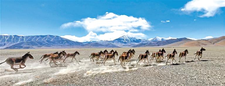圖為(wei) 在羌塘國家級自然保護區內(nei) 奔跑的藏野驢。邊巴多吉 攝 記者 溫凱 永青 洛桑旦增