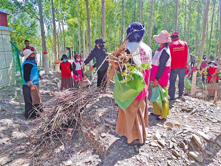 圖為(wei) 黨(dang) 員與(yu) 群眾(zhong) 一起撿拾樹枝。記者 丹增平措 攝