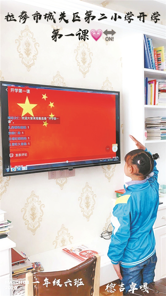 整潔的書(shu) 桌上擺放著嶄新的教材,穿上幹淨的校服、係好鮮豔的紅領巾,西藏拉薩市城關(guan) 區第二小學的學生鄭重地舉(ju) 起右手向電視屏幕裏的國旗敬禮。隨後,教師在線上為(wei) 學生進行授課,而孩子們(men) 也在家裏開啟了新的上課模式,聽課、記筆記、寫(xie) 作業(ye) 、背書(shu) ……