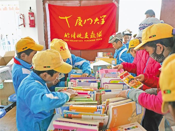 圖為(wei) 廈門大學竹蜻蜓支教隊在當雄縣龍仁鄉(xiang) 中心小學舉(ju) 辦流動圖書(shu) 館活動。通訊員 黃宇霞 高捷 何春雨 崔慶煒