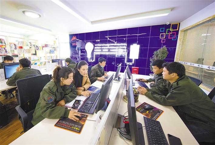 圖為(wei) 在該公司就業(ye) 的高校畢業(ye) 生正在設計廣告文案。記者 格桑吉美 攝