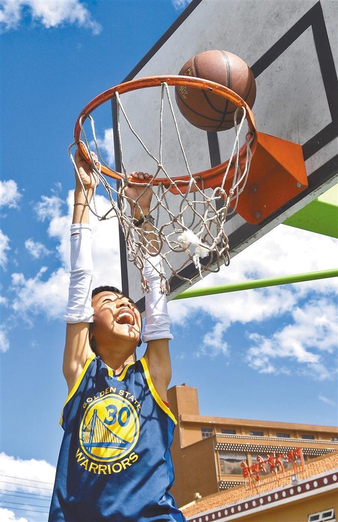 圖為(wei) 四川省阿壩藏族羌族自治州阿壩縣民族寄宿製小學的學生在體(ti) 育課上練習(xi) 扣籃(6月14日攝)。新華社記者 劉坤 攝