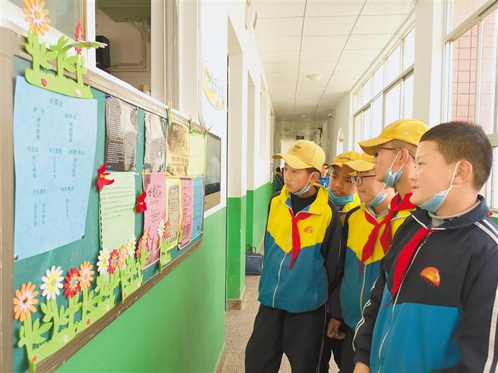 圖為(wei) 桑珠孜區第二中學初二學生在教師走廊參觀學習(xi) 班級動態展板。 記者 紮西頓珠 攝