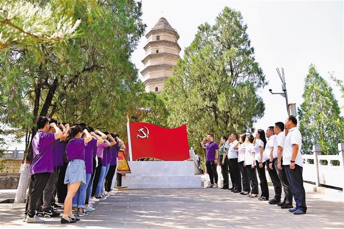 6月29日,黨(dang) 員幹部在延安市寶塔山重溫入黨(dang) 誓詞。新華社記者 張博文 攝