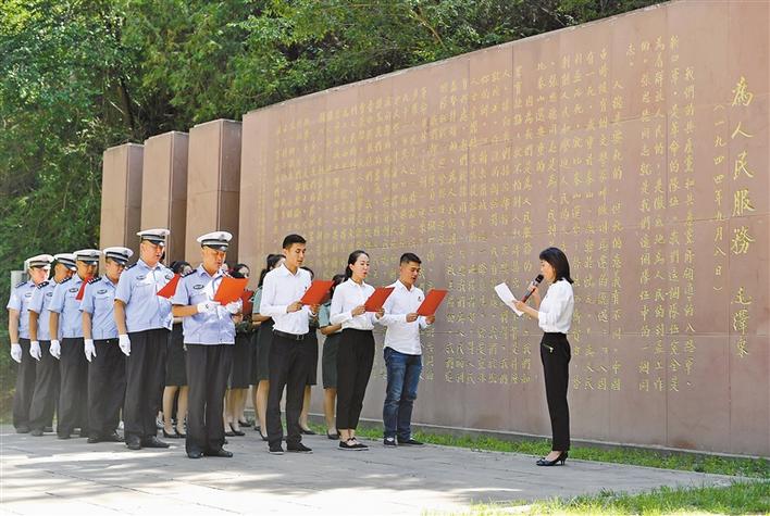 6月29日,在延安市張思德廣場,黨(dang) 員幹部在誦讀《為(wei) 人民服務》。新華社記者 張博文 攝