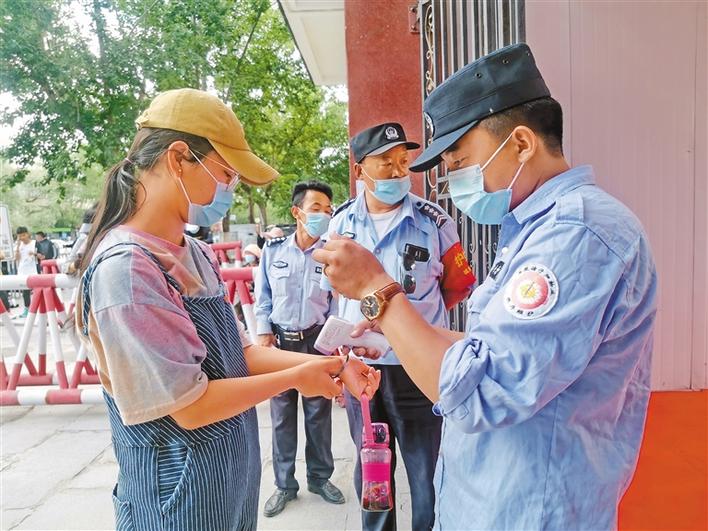 圖為(wei) 在拉薩中學考點門口,工作人員對即將進入考點熟悉環境的考生進行體(ti) 溫檢測和身份驗證。記者 王莉 攝