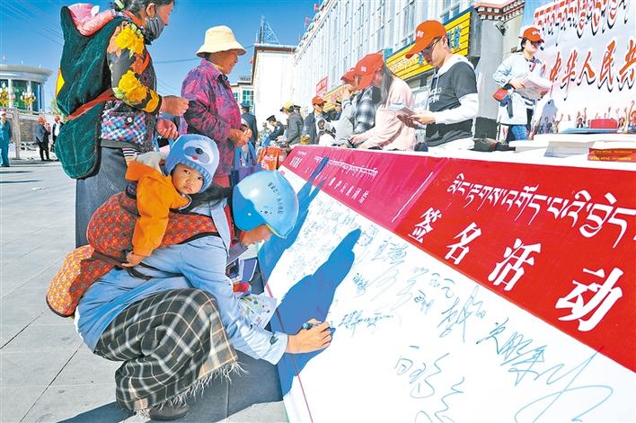 獅泉河鎮群眾(zhong) 在“民族團結月”簽名板上簽下自己的名字。 溫凱 洛桑旦增 紮西羅布 攝