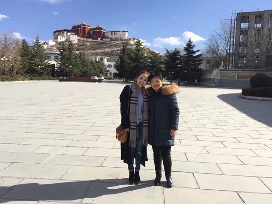 2017年1月,09屆宏誌生諾吉·曲擁措姆(左一)去拉薩中學看望呂淑霞。曲擁措姆現為(wei) 哈爾濱工業(ye) 大學在職博士,在共青團中央統戰部民族宗教處掛職。