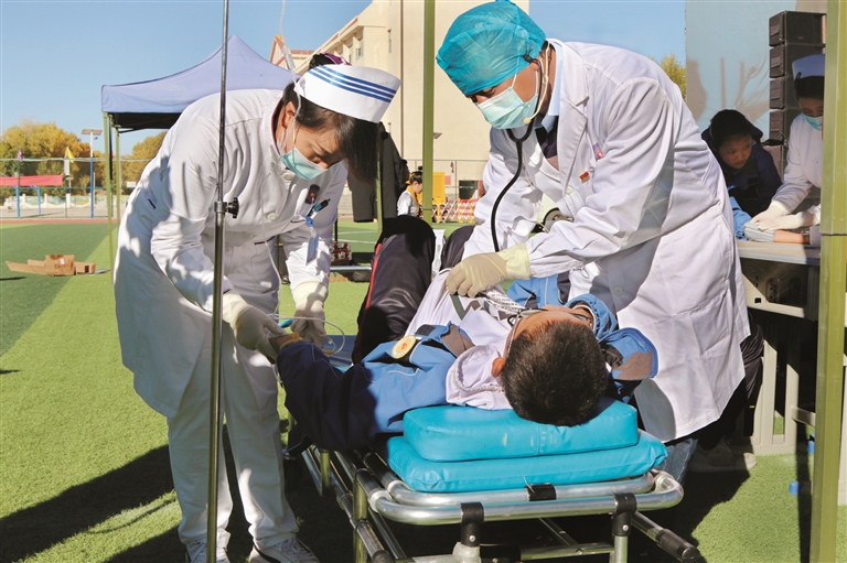 圖為(wei) 在演練現場,醫生正在對“中毒”學生進行診療、救治。 拉薩融媒記者 龍俊霖攝