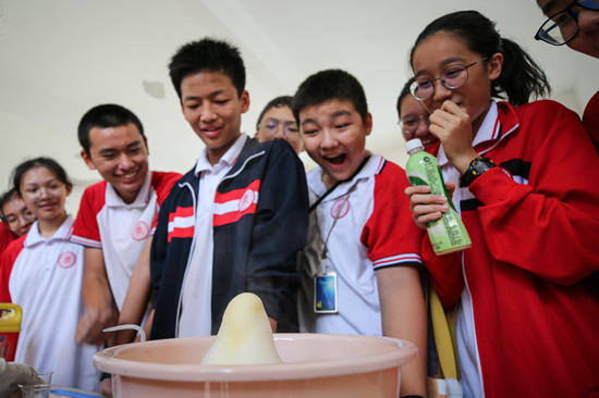 10月26日,北京師範大學海口附屬學校的學生參與(yu) 化學趣味實驗。當日,北京師範大學海口附屬學校舉(ju) 行第三屆科技人文節活動,在校內(nei) 營造愛科學、學科學的良好氛圍。