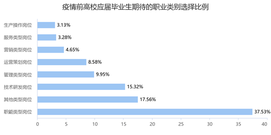 疫情前應屆畢業(ye) 生期待的職業(ye) 類別選擇比例由高到低依次為(wei) 職能類型崗位(如行政、人事、財務等,37.53%)、其他類型崗位(17.56%)、技術研發崗位(如研發工程師、測試等,15.32%)、管理類型崗位(9.95%)、運營策劃崗位(如運營、產(chan) 品、設計等,8.58%)、服務類型崗位(如客服、服務員、店員等,3.28%)、生產(chan) 操作崗位(如職業(ye) 業(ye) 生產(chan) 崗位等,3.13%)。疫情後和疫情前完全一致,選擇比例由高到低依次為(wei) 職能類型崗位(37.65%)、其他類型崗位(18.08%)、技術研發崗位(14.67%)、管理類型崗位(9.79%)、運營策劃崗位(8.40%)、服務類型崗位(3.53%)、生產(chan) 操作崗位(3.18%)。