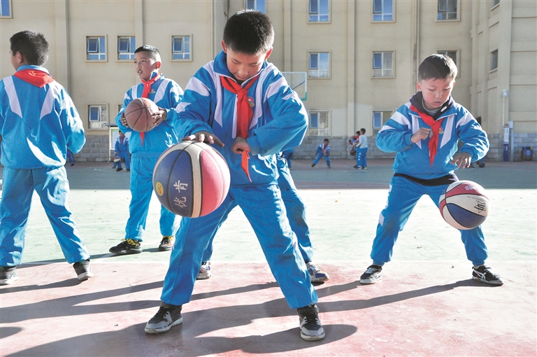 圖為(wei) 拉薩市實驗小學學生在教練員帶領下進行籃球訓練。趙耀鐵攝