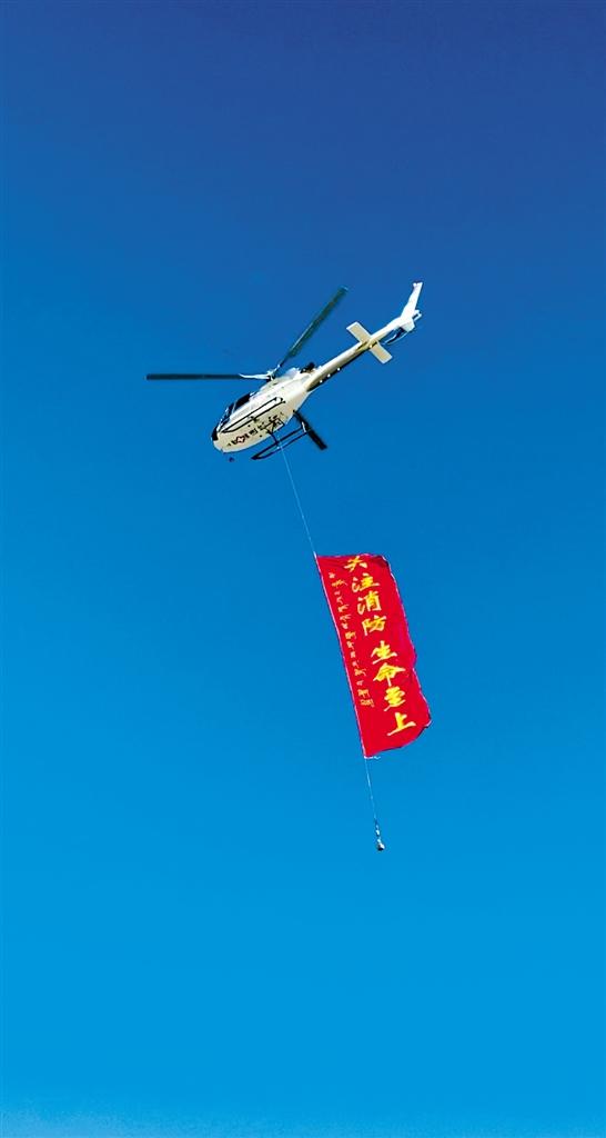 直升機攜帶”關(guan) 注消防 生命至上“的標語開展空中宣傳(chuan) 。