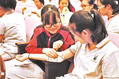 鏡頭:創傷(shang) 救護、止血包紮練習(xi) 、模擬人心髒複蘇操作……在首師附密雲(yun) 中學的教室裏,每逢遇到應急救護課程,同學們(men) 都會(hui) 邊聽邊記,積極參與(yu) 。校醫老師先給同學們(men) 講應急救護的知識,隨後還帶大家現場實踐操作,包紮有哪些方法、如何給傷(shang) 者進行固定……老師和學生們(men) 通過互相操作記住每個(ge) 細節,並及時反饋糾正。