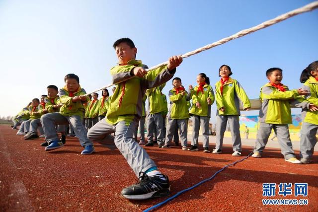 11月12日,學生在大課間參加拔河比賽。 位於(yu) 山東(dong) 省青島市即墨區的青島藍穀高新區東(dong) 皋埠小學是一所鄉(xiang) 村學校,近年來,學校開展以乒乓球、籃球、跳繩等運動為(wei) 主的大課間活動,讓孩子們(men) 在享受運動的同時愉悅身心,增強體(ti) 質。 新華社發(梁孝鵬攝)