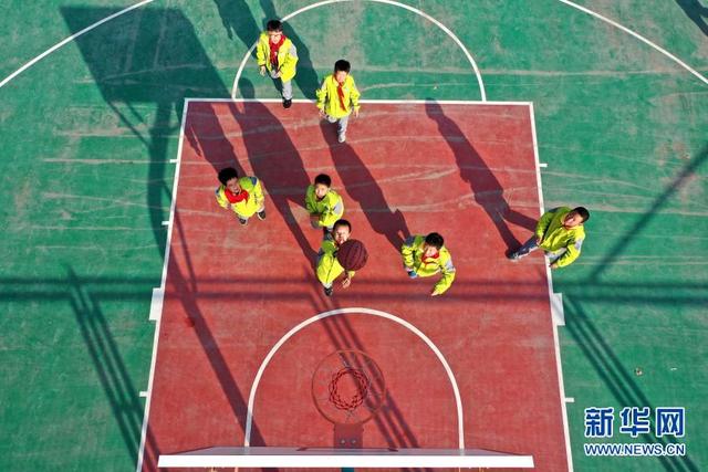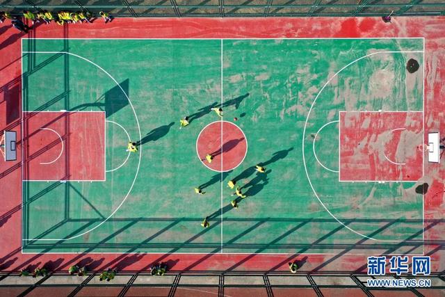 11月12日,學生在大課間打籃球(無人機照片)。 位於(yu) 山東(dong) 省青島市即墨區的青島藍穀高新區東(dong) 皋埠小學是一所鄉(xiang) 村學校,近年來,學校開展以乒乓球、籃球、跳繩等運動為(wei) 主的大課間活動,讓孩子們(men) 在享受運動的同時愉悅身心,增強體(ti) 質。 新華社發(梁孝鵬攝)
