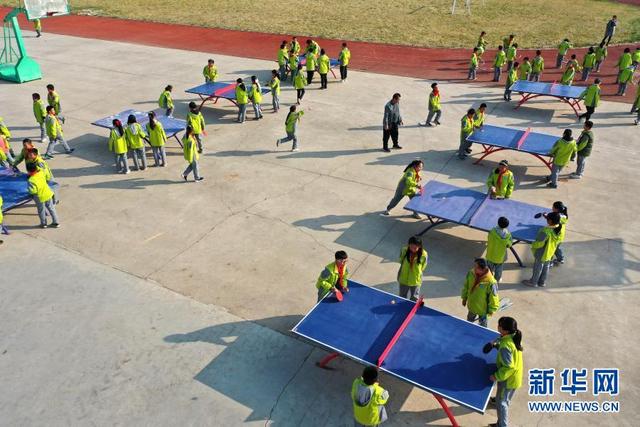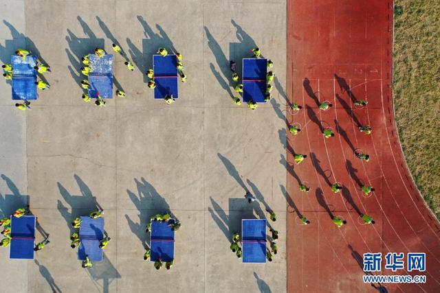 11月12日,學生在大課間打乒乓球(無人機照片)。 位於(yu) 山東(dong) 省青島市即墨區的青島藍穀高新區東(dong) 皋埠小學是一所鄉(xiang) 村學校,近年來,學校開展以乒乓球、籃球、跳繩等運動為(wei) 主的大課間活動,讓孩子們(men) 在享受運動的同時愉悅身心,增強體(ti) 質。 新華社發(梁孝鵬攝)