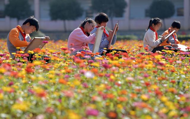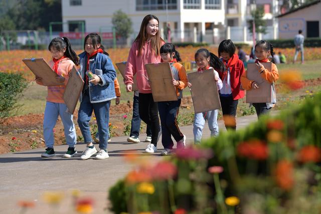 寨下鎮中心小學的學生們(men) 在花海上美術課(11月9日攝)。