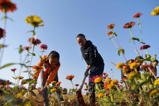 寨下鎮中心小學的學生們(men) 在花田勞動,給花鬆土、澆水(11月9日攝)。