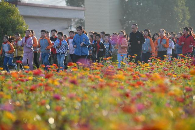 寨下鎮中心小學校長殷大福帶著學生們(men) 在花田邊晨練(11月10日攝)。