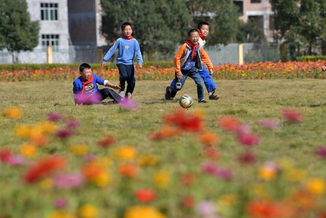 寨下鎮中心小學的學生們(men) 在花田間的草地上踢足球(11月9日攝)。