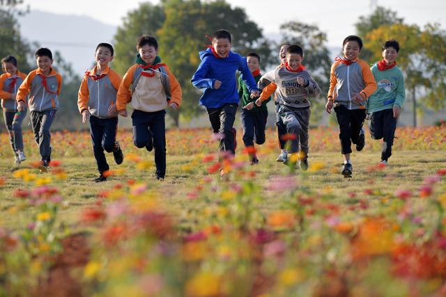 寨下鎮中心小學的學生們(men) 在花田間的綠地玩耍(11月9日攝)。