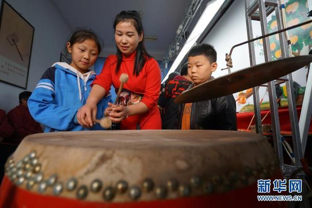 11月24日,皮影戲藝人在河北省沙河市西油村小學指導學生打鼓。