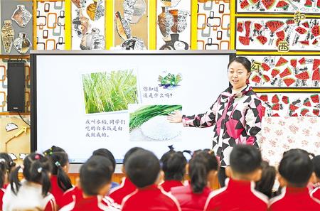 課堂上孩子們(men) 通過觀察、觸摸、分類,來了解穀物。