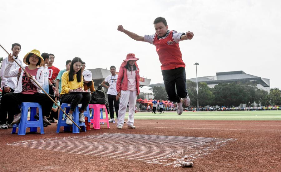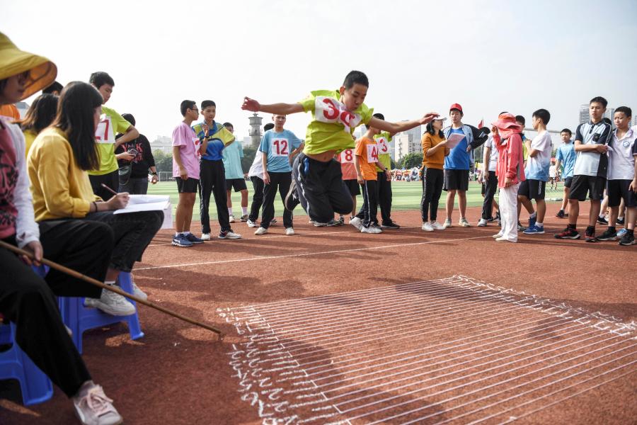 11月26日, 廣西大學附屬中學初中年級學生在立定跳遠比賽中。新華社記者張愛林攝