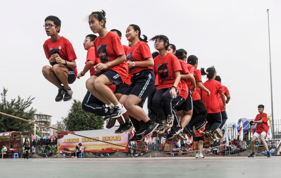11月26日, 廣西大學附屬中學初中年級學生在集體(ti) 跳繩比賽中。新華社記者張愛林攝