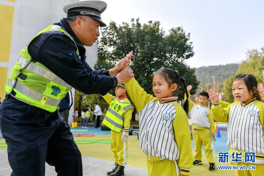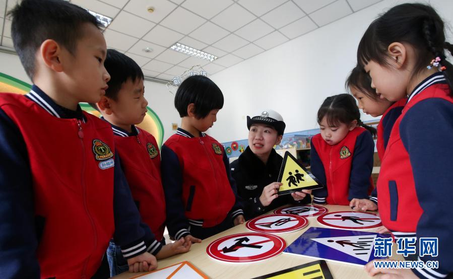 11月30日,交警在位於(yu) 濟南市的山東(dong) 省實驗幼兒(er) 園南校區指導孩子們(men) 識別交通安全標識牌。新華社發(郝群英 攝)