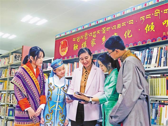 圖為(wei) 共青團西藏自治區委員會(hui) 副書(shu) 記格桑卓瑪(左三)向武漢西藏中學的學生們(men) 介紹“觸摸家鄉(xiang) 變化·傾(qing) 聽黨(dang) 的聲音”主題書(shu) 刊。央金 攝