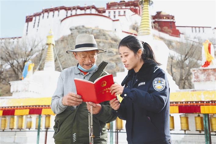圖為(wei) 西藏出入境邊防檢查總站執法調查支隊民警在宗角祿康公園向過往群眾(zhong) 宣傳(chuan) 憲法知識。仁青旺堆 張一鳴 攝